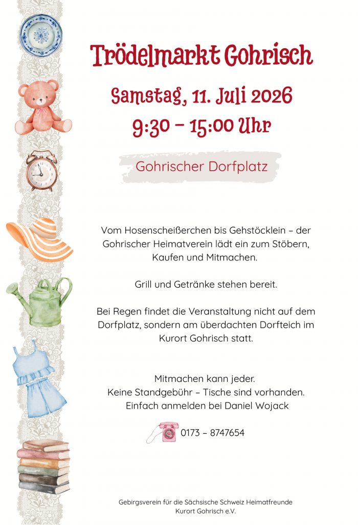 Der zweite Trödelmarkt Gohrisch findet am Sonnabend, dem 11. Juli 2026 von 9:30 bis 15 Uhr auf dem Gohrischer Dorfplatz statt. Bei schlechtem Wetter werden wir auf den überdachten Bereich am Dorfteich ausweichen. Details und Hinweise zu Randbedingungen finden Sie hier.